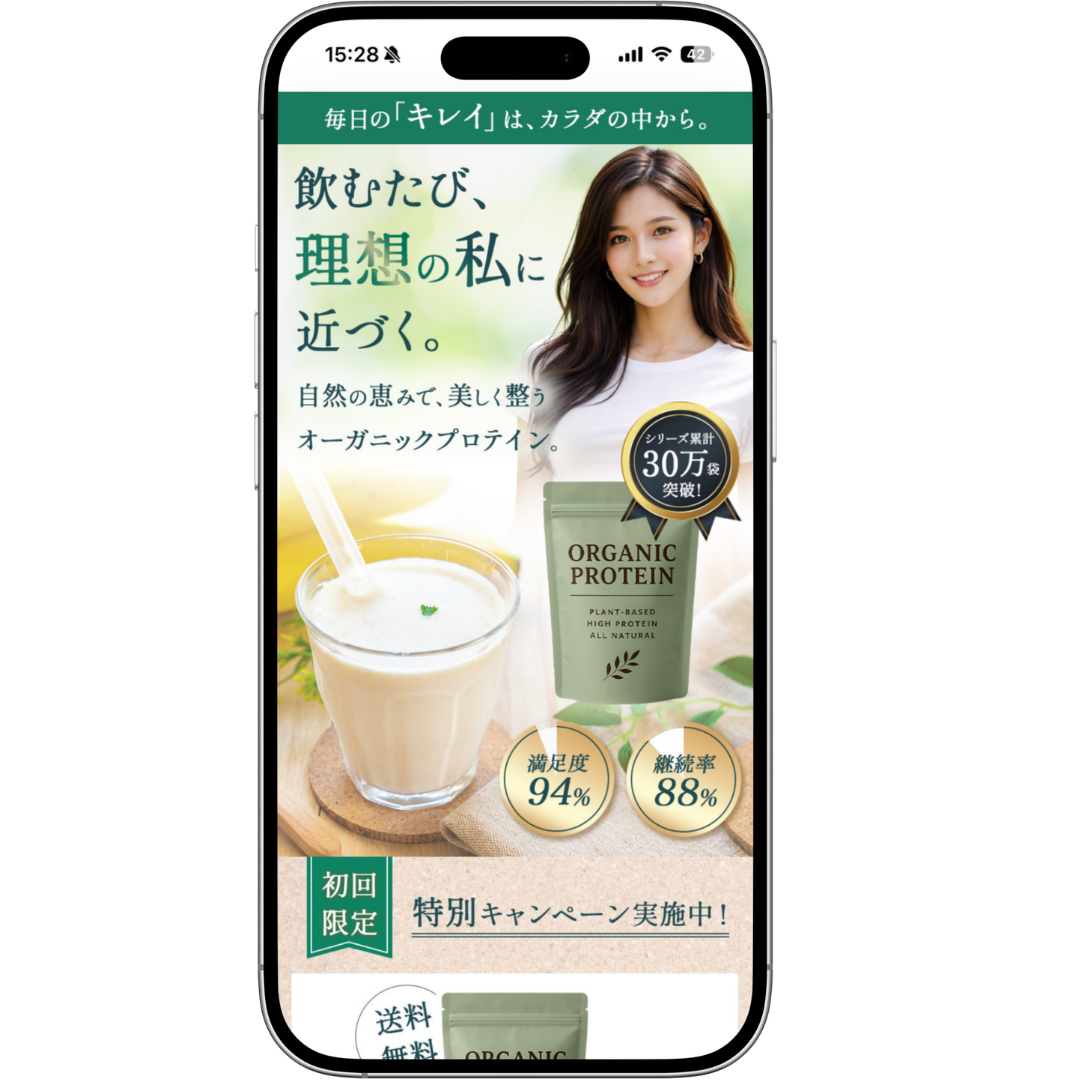 オーガニックプロテインの販売LPを作成しました。オーガニックの自然の印象を与えるため、グリーンをメインカラーとして選択しました。離脱を防ぐため、なるべくセクション間をくっきりと分けずグラデーションや曲線で繋ぎました。
